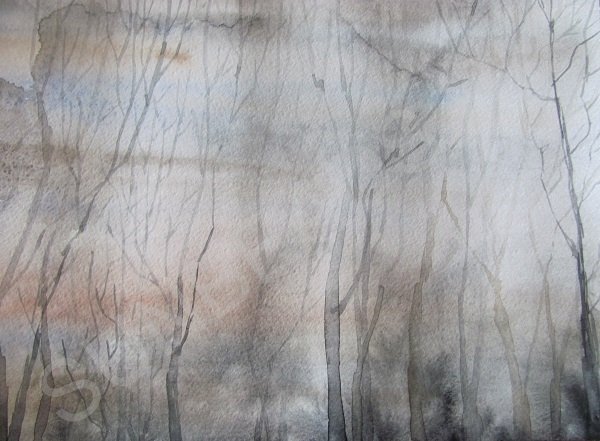 Рисуем самым кончиком кисти прерывистые ломаные линии, чтобы у нас получились, как будто немного озябшие деревца. Следите за тем, чтобы у вас появилось несколько «слоёв» деревьев самые бледные, затем немного по-ярче, еще ярче. Это позволит создать иллюзию глубины пространства. Сами деревья не раскрашивайте одинаковым тоном. Помните, что ствол цилиндрической формы, то есть объёмный, местами он неровный, кора может быть темнее в одном месте, светлее в другом. Ветки прорисовываем нежнее по тону, чем ствол.