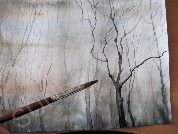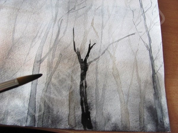 Следующий шаг. Более сочным цветом поверх бледных рисуем темные по тону деревья. Для этого смешивайте попеременно черную акварель с синей, черную с коричневой, чтобы получились немного разные по оттенку стволы деревьев.