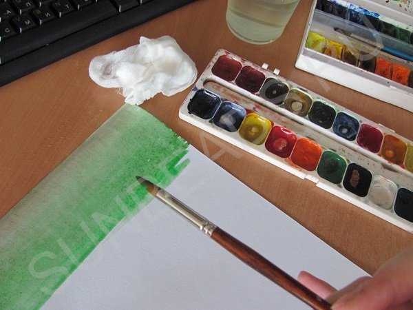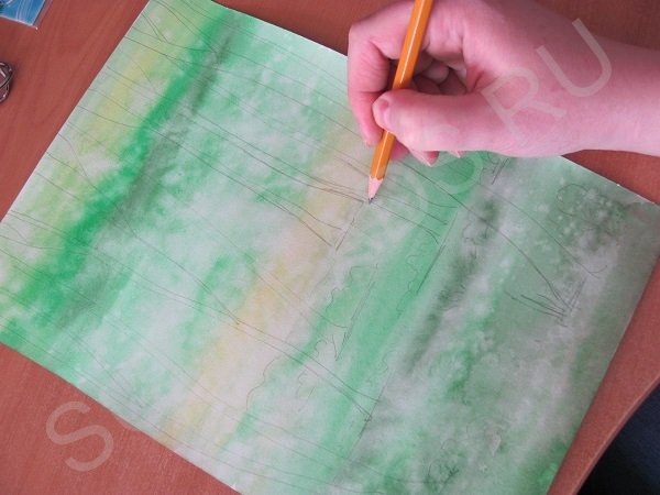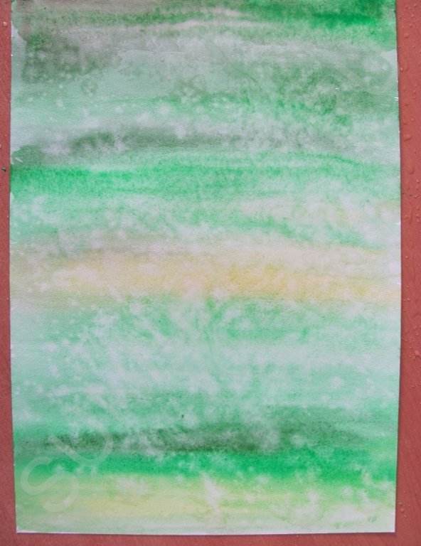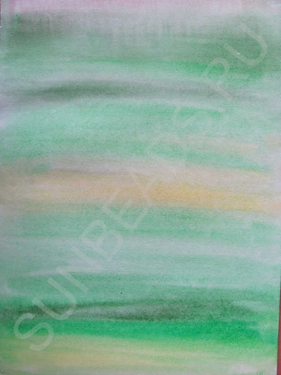 Распускаем по влажному листу оттенки зеленого цвета, можно добавить коричневый, охру, получится живописный фон для следующего этапа работы.