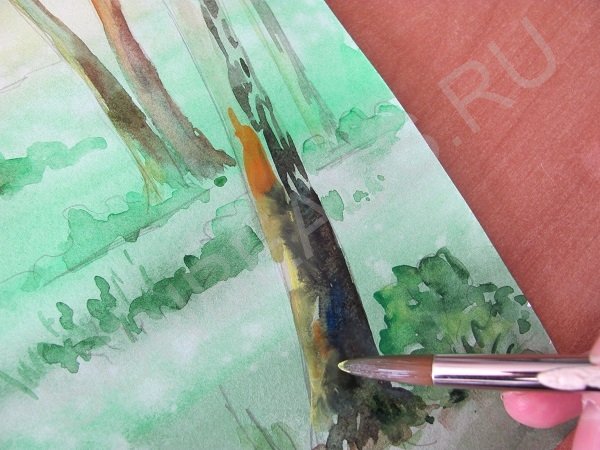 Раскрашиваем деревья, кустарники. Сразу определим, что свет у нас на рисунке падает слева, значит тени на стволах деревьев будут справа. Тени рисуем, смешивая коричневый и фиолетовый, свет пишем, смешивая коричневый, охру или желтый. Дальние деревья, кустики, травинки и веточки должны быть нарисованы бледнее, чем ближние.