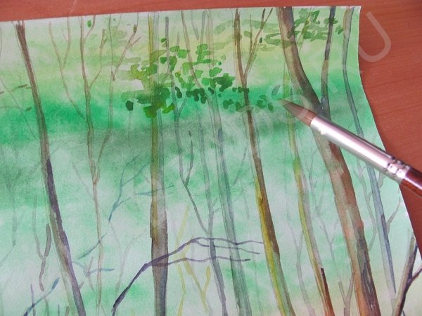 Смешиваем зеленую, охру и желтую краски, пятнышками рисуем молодую весеннюю листву. Какие-то листики должны получаться прозрачными, словно пронизанные солнечным светом. Другие будут более темными. Такое сочетание создаст иллюзию объема.