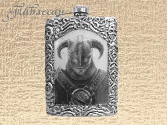 Фляжка с имитацией чеканки в технике декупаж. На лицевой стороне Довакин, герой популярной компьютерной игры «Скайрим». На оборотной стороне богиня любви из «Скайрима». Картинку можно заменить по вашему желанию. Приятная на ощупь. Верхняя часть около головки не декорирована, чтобюы можно было смело пить прямо из горлышка)). Объем 240 мл