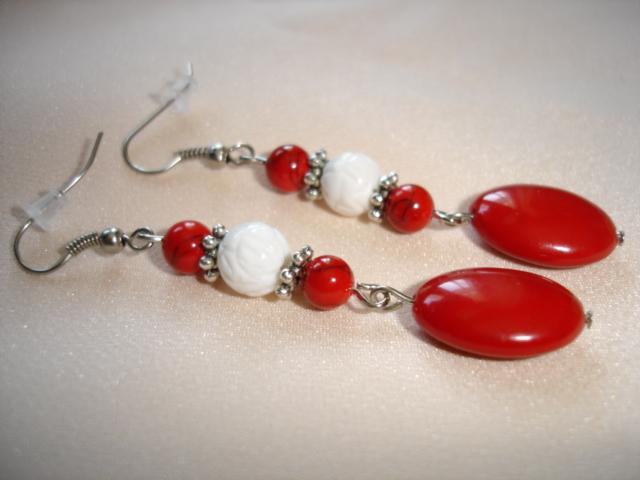 Серьги средней длины (7 см) изготовлены из бусин коралла двух цветом и трех размеров. Фурнитура под серебро.