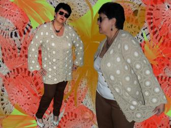 Связан крючком их грубоволокнистого хлопка вида рогожки. Не смотря на это очень приятен для тела. Силуэт прямой, рукав длинный, вырез горловины неглубокий, застежка на 12 пуговиц. Связан на размер с обхватом груди 118 см плюс/минус 2 см, рост 170см плюс минус 3 см. Можно носить в любой сезон, как блузку на застежках и как жакет на топ или водолазку. Цвет бежевый основной, молочный добавлен. Длина середина бедра.