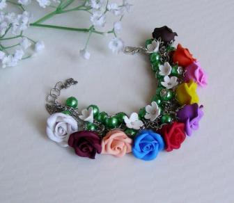 Яркий браслет с розами из запекаемой пластики. Изделие не боится воды. В браслете добавлены маленькие белые цветочки из пластики. Зеленые керамические жемчужины металлические листики. Размер браслета регулируется под покупателя. Браслет прекрасно украсит ваш наряд. Может послужить подарком на любой случай.
