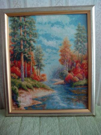 Унылая пора очей очарование. Сказочные, яркие краски, прозрачный звенящий воздух, уже холодное, но очень красивое небо все это золотая осень. Эта вышивка будет напоминать Вам это время, она может украсить любой интерьер. Вышивка состоит из 40260 крестиков, вышита мулине 45 оттенков, выполнена на канве Аида № 18. Вышивка ручной работы, оформлена в багетной мастерской.