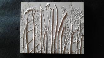 гипсовая плитка на которой тончайшие отпечатки трав, цветов и листьев. Тонкие, хрупкие и трепетные, выглядят как доисторические окаменелости, которые хочется рассмотреть до мельчайших деталей. Плитка уникальна и существует в единственном экземпляре.
