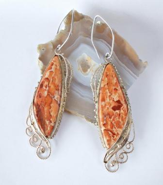 Ажурные длинные филигранные серьги с натуральной пёстро-красно-оранжевой яшмой. Ширина 2 см, длина без швензы 6,5 см, со швензой 8,5 см.Весь металлический узор спаян полностью вручную. Основной материал нейзильберовая проволока, плюс покрытие серебром. Покрытие сделано при высокой температуре под пламенем горелки, поэтому оно не будет отслаиваться. Швензы серебро 925 пробы, толщина проволоки 1 мм (крепкие, не разогнутся).