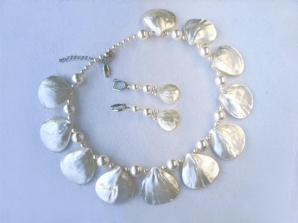 Колье «Aloha» из крупного жемчуга Сваровски, крупных лепестков перламутра 3Х3см и посеребрённой фурнитуры. Швензы из латуни с покрытием из серебра 999 пробы и английским замочком.