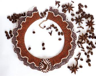 А всё вместе,- и рисунок яшмы, и оправа кабошона, и волны плетёной ленты дают стойкую ассоциацию с кофе, с ароматом изысканного кофе с пряностями...