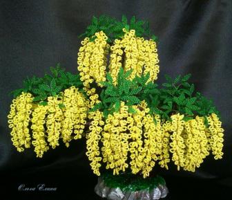 Акация сделана из чешского бисера. Камень отточен специальными ножами, покрыт акриловой краской и лаком. Ствол вылеплен из гипса. Высота Акации 35 см