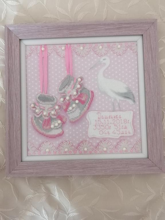 Метрика для девочки. Размер готовой работы 20×20 см.