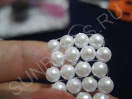 Нанизываем вторую жемчужину. Проходим иголкой под низ в отверстие первой бусины и вытягиваем нитку к верху. Два элемента первого ряда закреплены.