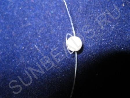 Первая бусинка закрепляется обычным способом. Сначала пропускаем леску через отверстие жемчужинки. Затем возвращаемся под низ бусины и выводим леску обратно наверх через отверстие.