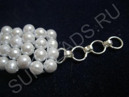 Аналогичным образом прикрепляем три остальных бусины. При этом, так как перекладинок для крепления только три, третью и четвертую бусину второго и последующих рядов присоединяем к одной, последней перекладине.